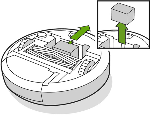 Si la batterie est retirée du robot pendant 15 minutes, la batterie s'éteindra. Si Roomba ne s'allume pas après le retrait de la batterie, placez le robot sur la Home Base pour le réveiller. -